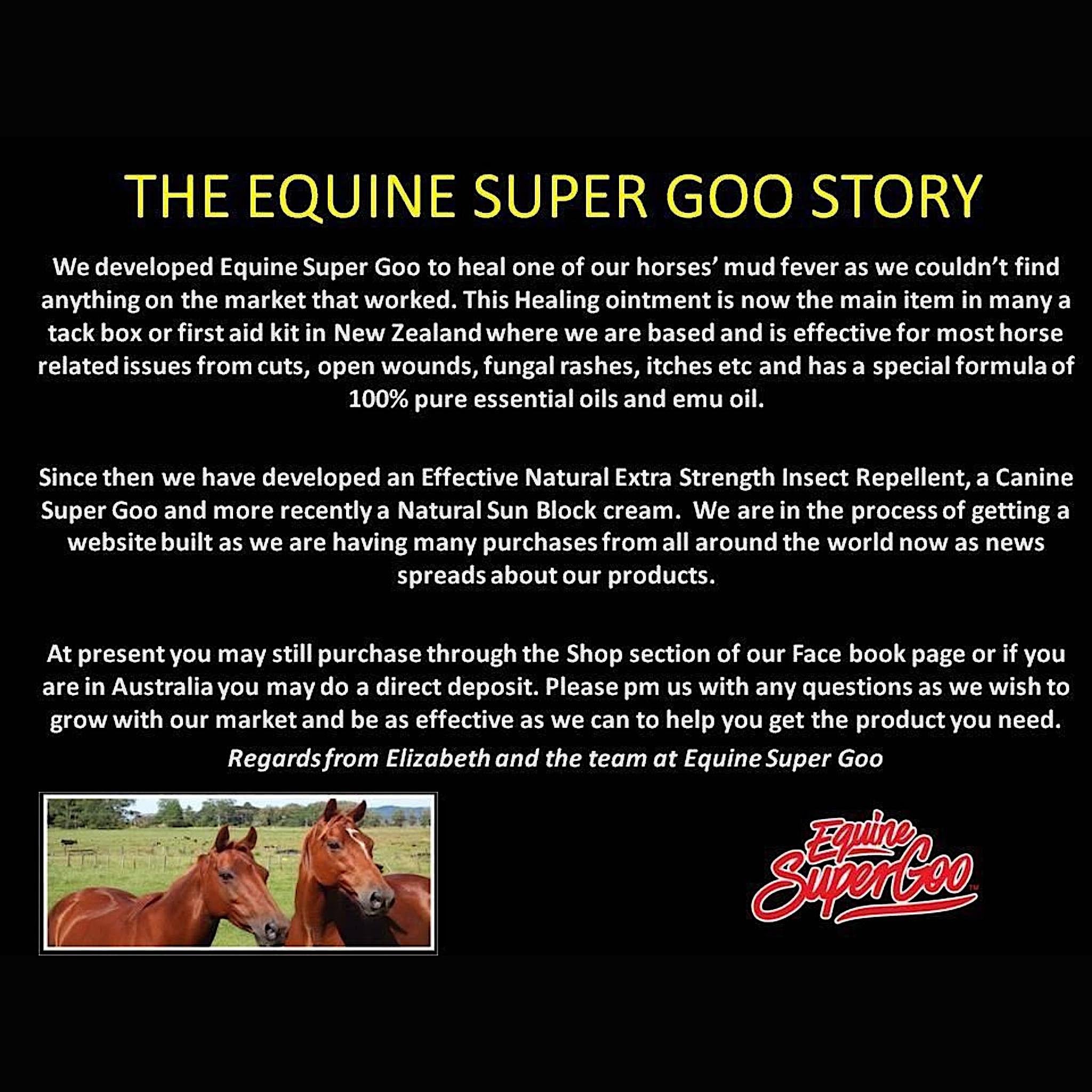 Equine Super Goo has unsurpassed anti-fungal and antiseptic properties that has proven to be amazing for treating wounds, promoting hair growth and easing pain for wounds and muscles and relieving itchy skin. With its pain-killing effect, antioxidant levels, and ability to reach deep into the skin, Equine Super Goo can be applied to all wounds, cuts and bruises. It can also help ease the pain of minor wounds and stop itching from ticks and flies