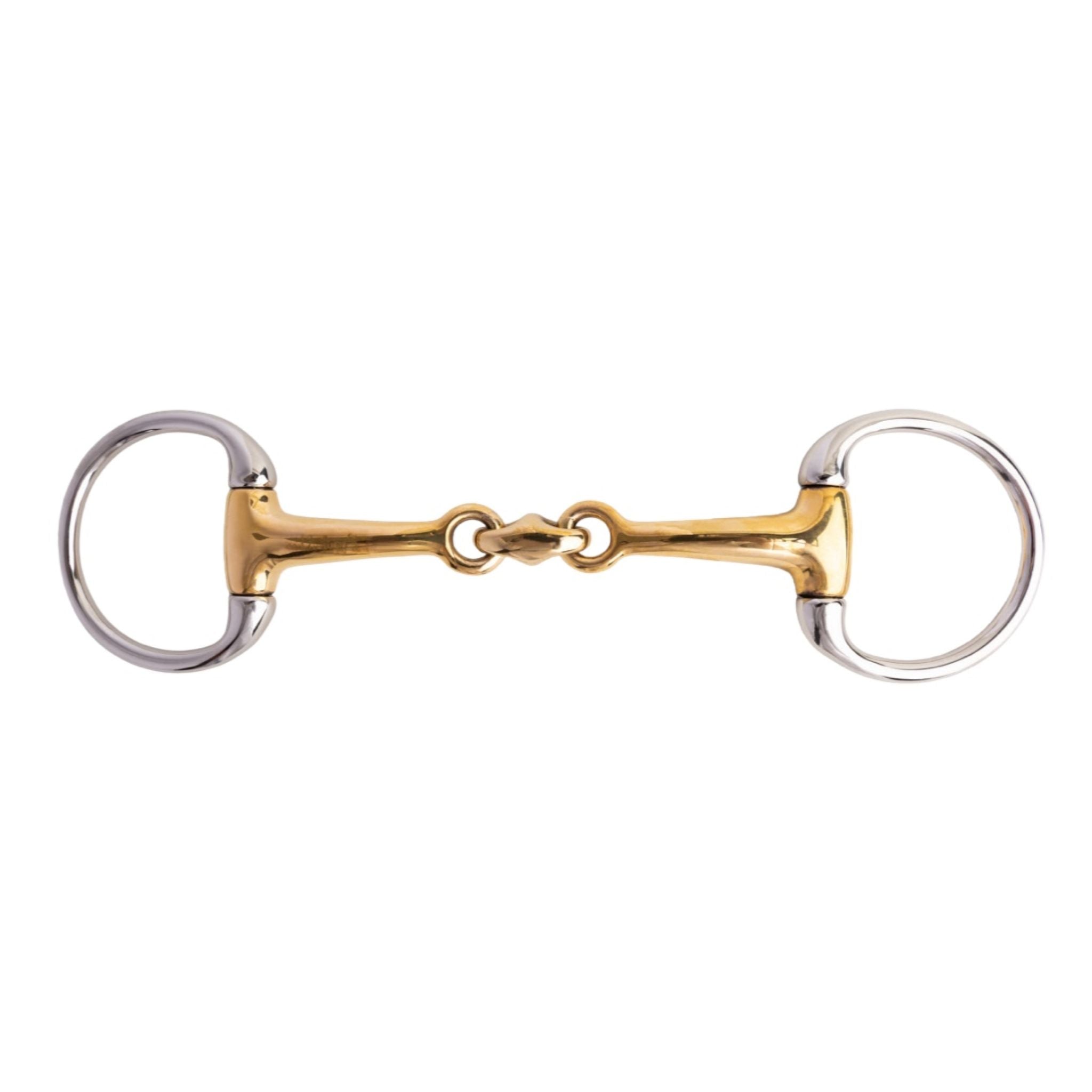The Cavalier Eggbutt Training Link Snaffle Bit has a gold mouth piece with stainless steel rings.